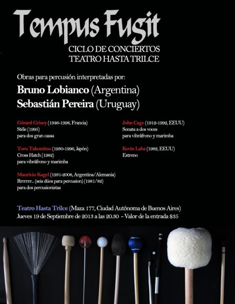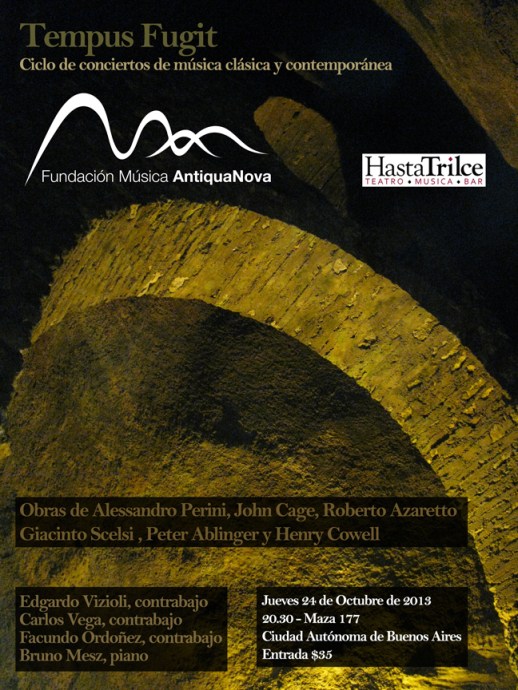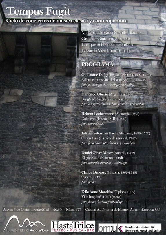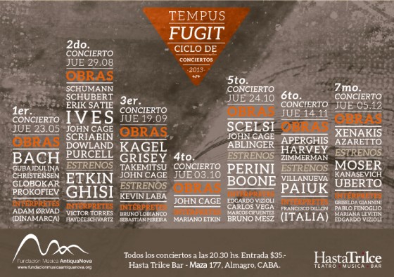 Tempus Fugit es el primer ciclo anual de conciertos de música de cámara producido e ideado por la Fundación Música AntiquaNova en la Ciudad Autónoma de Buenos Aires. Con un formato de siete conciertos de mayo a diciembre de 2013, reconocidos Interpretes de Argentina, Uruguay, Dinamarca e Italia interpretarán una amplia programación que recorre desde la música antigua a la contemporánea y que incluye una gran serie de encargos realizados a diversos compositores argentinos e internacionales junto a compositores y obras del repertorio clásico y de la actualidad.